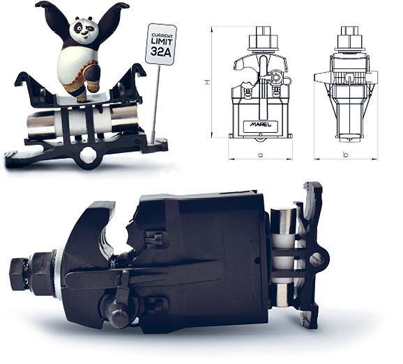 MAREL Izolovana Vodonepropusna Stezaljka sa integrisanim osiguračem Tip FC se koristi za ostvarenje kontakta istovremenim probijanjem izolacije na provodnicima NN SKS-a kao glavnog voda i na priključnom provodniku objekta ili na provodniku javnog osvetljenja bez obzira da li je su provodnici Al ili Cu. Ova stezaljka ima verziju za neizolovani glavni goli vod, sa izlovanim kontaktnim mostom i sa neizolovanim kontaktnim mostom (sa kontaktnim pločicama). Telo stezaljke je napravljeno od plastike otporne na visoku temperaturu i UV zračenje, a gumica od elastomera eliminiše mogućnost pojave elektrolitičke korozije jer sprečava ulazak vlage na kontaktnim mestima. Kontakti su zaštićeni elektro-kontaktnom mašću. Važna i jedinstvena karakteristika ove stezaljke je da ima funkciju da ograniči maksimalnu jačinu električne struje (Imax) kroz konektor, što je važno da zaštiti električnu mrežu od preopterećenja a i da zaštiti potrošača električne energije od pada napona u električnoj distributivnoj mreži. Stezaljka ima električki izolovano kućište u kome se nalazi standardni osigurač dimenzija 10,3x38 mm maksimalnog strujnog opterećenja od 1 do 32 A.